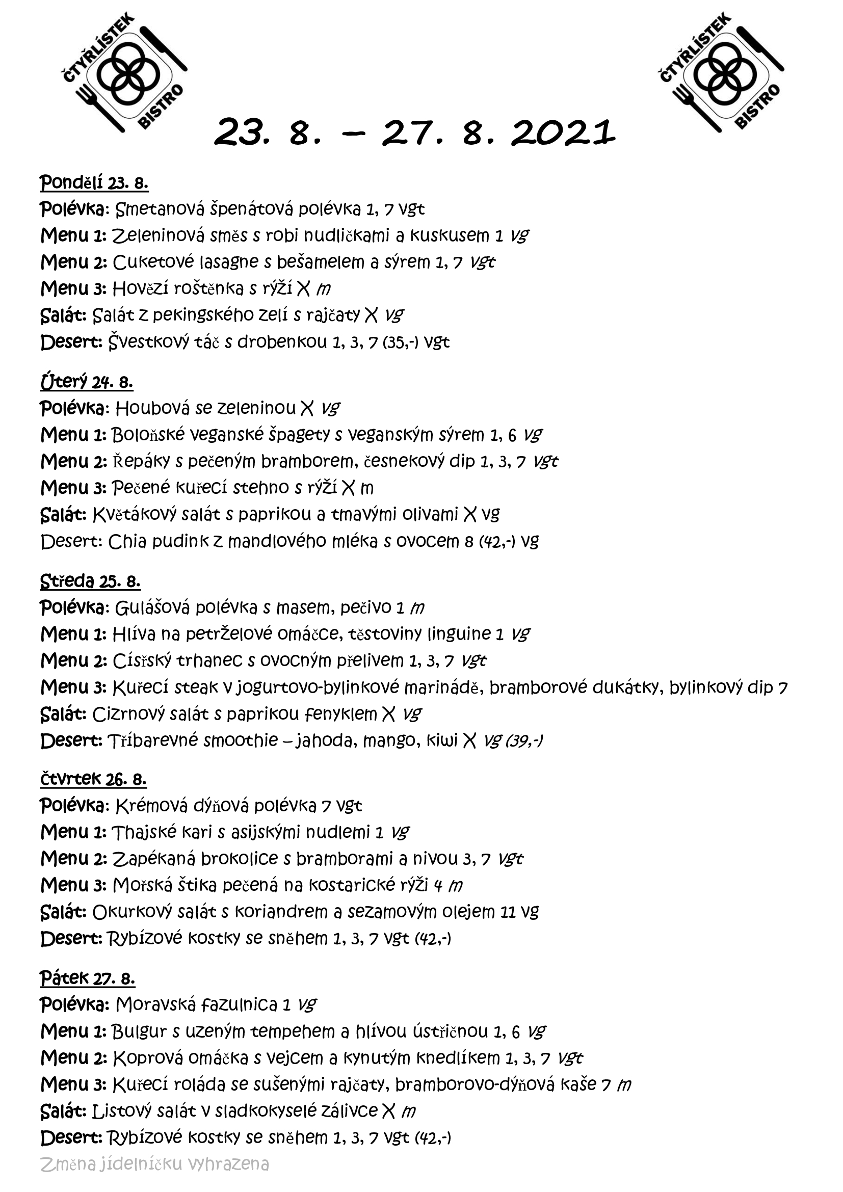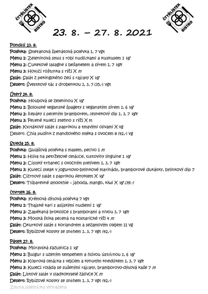 Jídelníček-4-9 Image info Image published on: 23.8.2021 Image size: 1654 × 2339 px Image file name: Jídelníček-4-9.jpg 0 comments on “Jídelníček-4-9” Add yours → Napsat komentář Zrušit odpověď na komentář Vaše e-mailová adresa nebude zveřejněna. Vyžadované informace jsou označeny *Komentář Jméno * E-mail * Webová stránka Informujte mě o nových příspěvcích emailem.